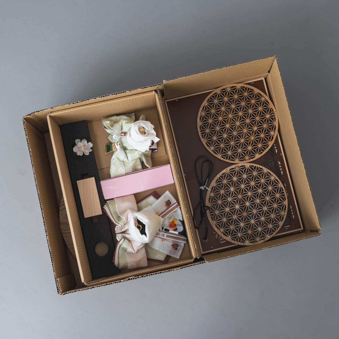 桜柄は落ち着いた現代色で、伝統の技を活かしつつ雛人形様のために丁寧に織り上げた、別誂の西陣織となります。