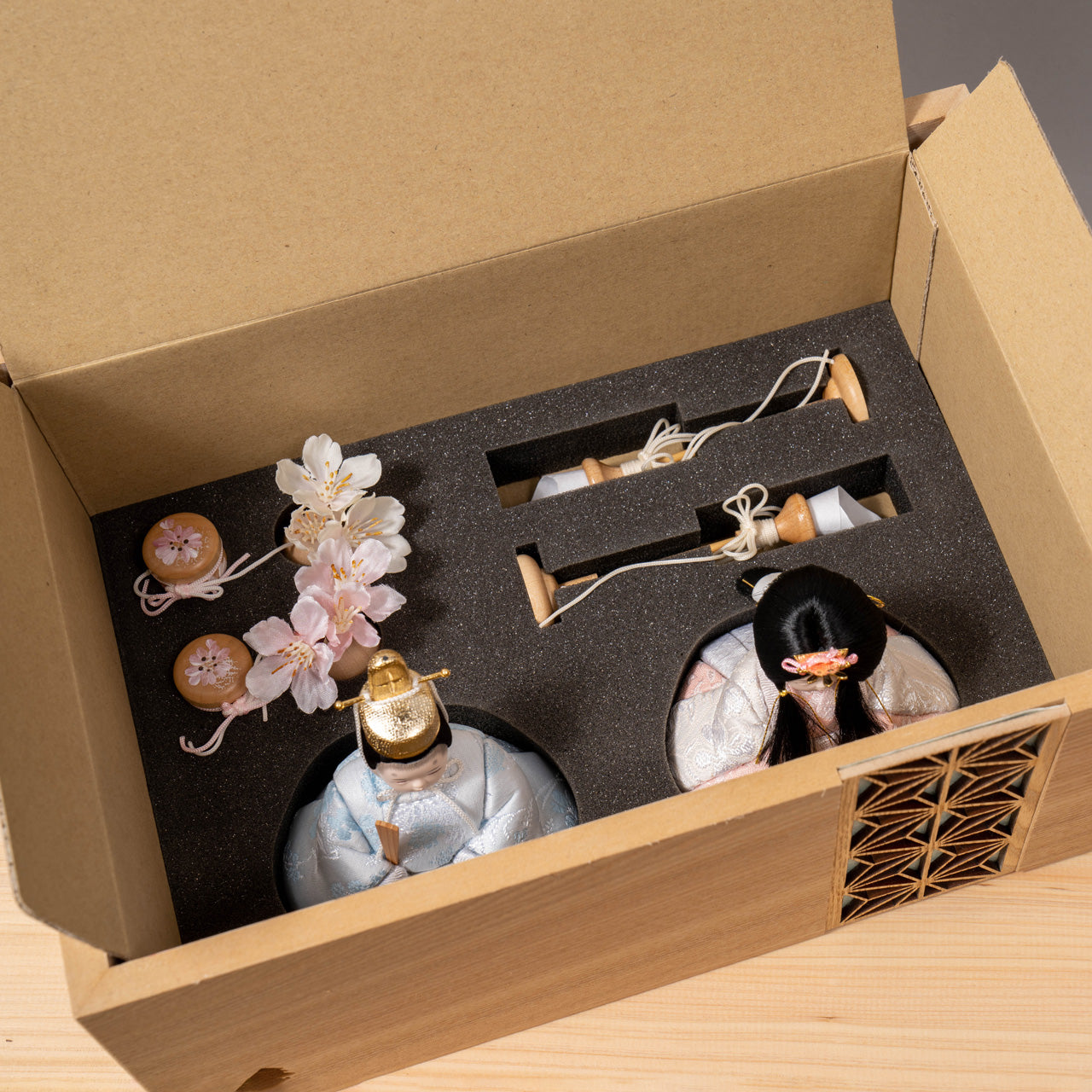 天然木の風合いを生かした木都の羽子板はひな人形と一緒に飾るのにぴったり。