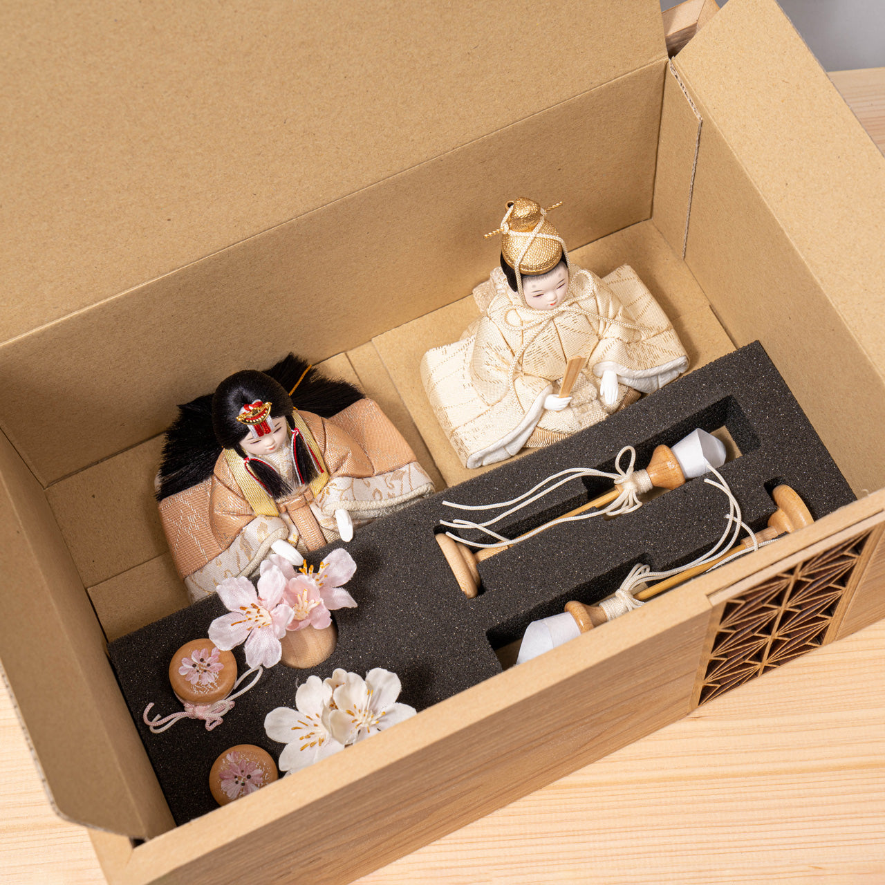 天然木の風合いを生かした木都の羽子板はひな人形と一緒に飾るのにぴったり。