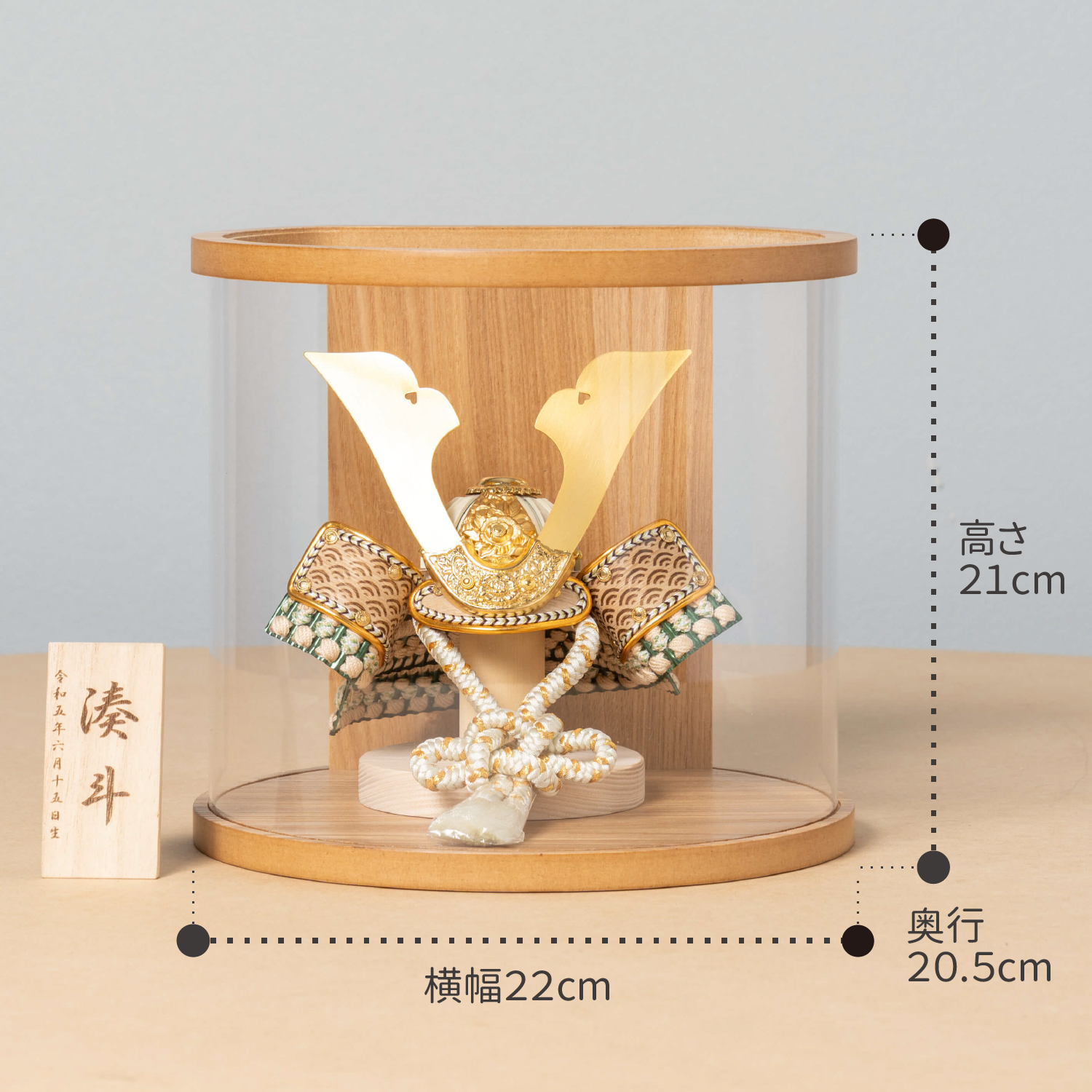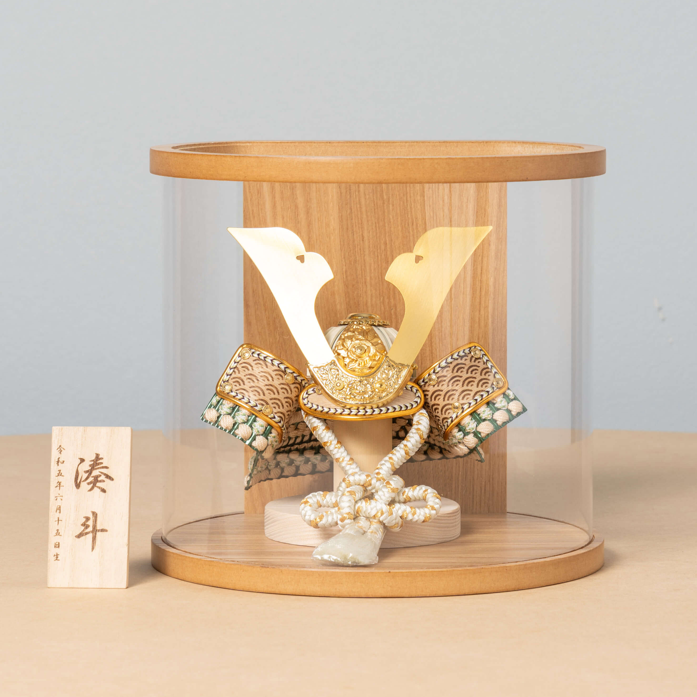 角をなくし丸みをつけた円柱型のケースは従来のケースにある柱がない為、中に飾る兜がより見やすくなっております。