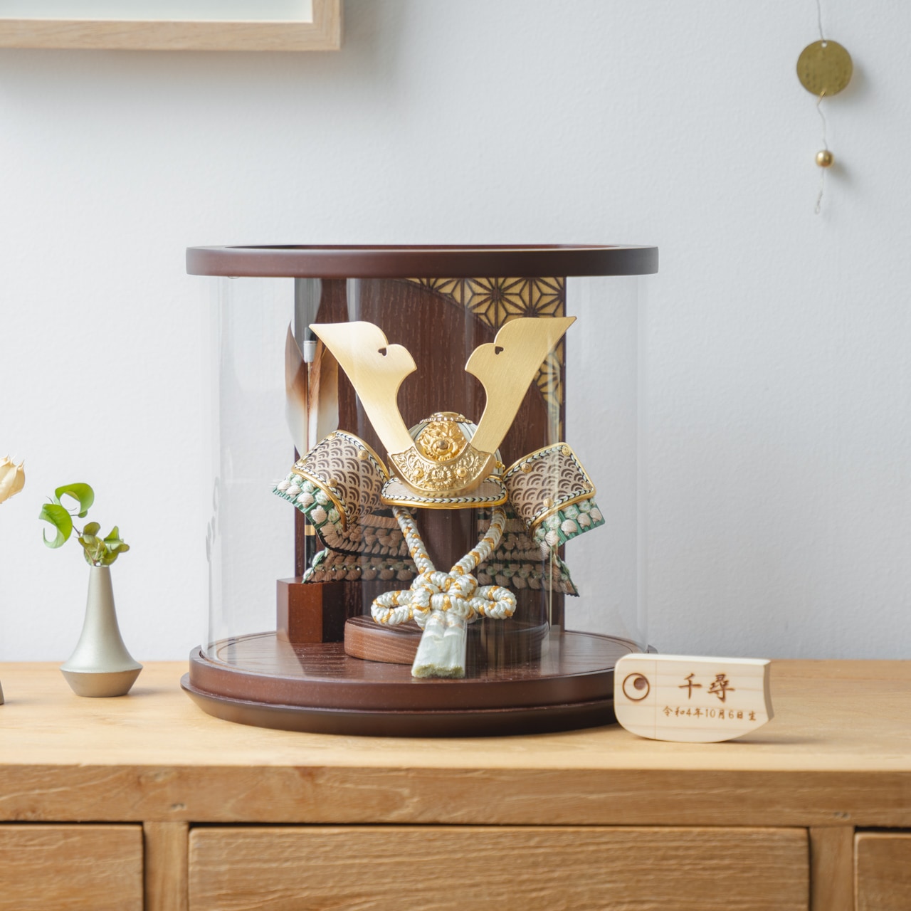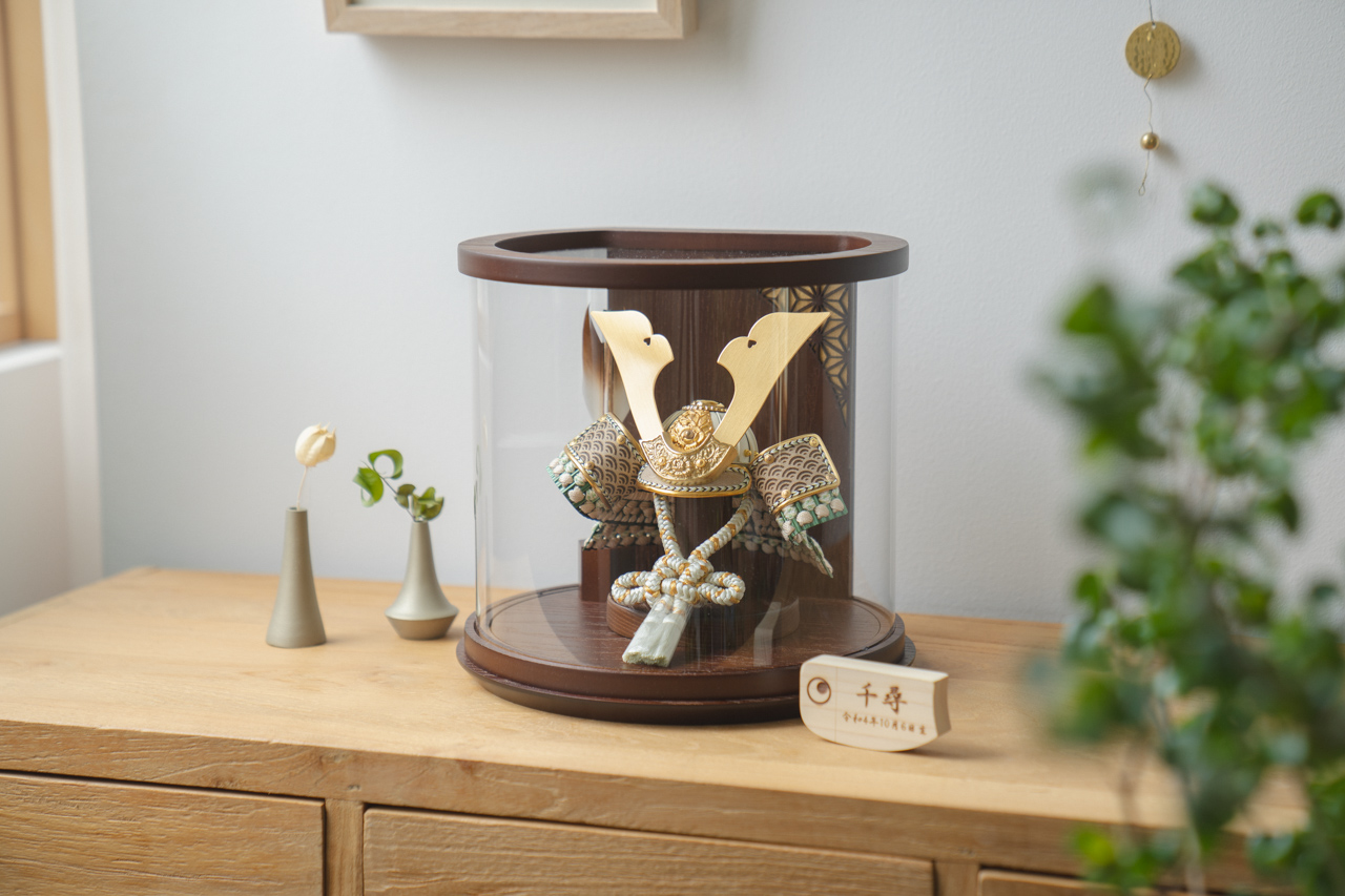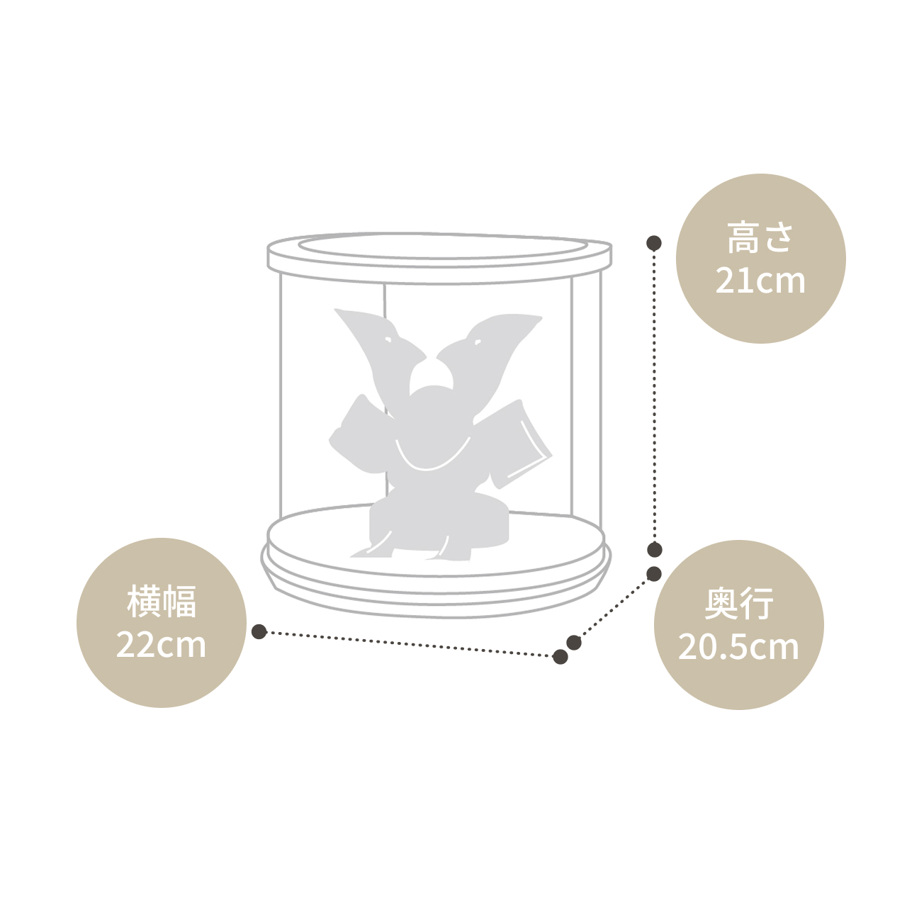 角をなくし丸みをつけた円柱型のケースは従来のケースにある柱がない為、中に飾る兜がより見やすくなっております。