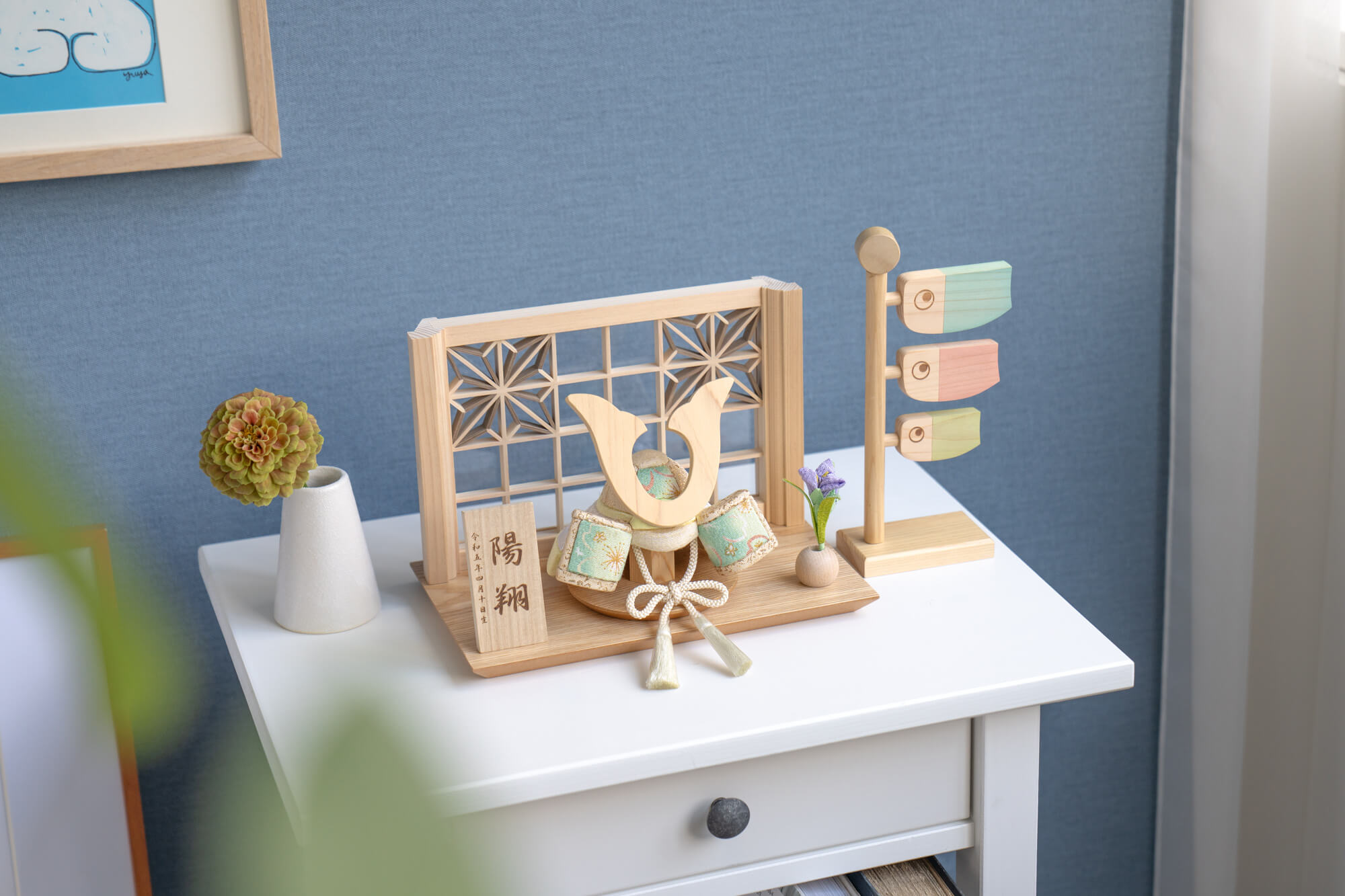 屏風として飾れば組子細工の美しさが、下台として飾れば木目込兜の愛らしさが引き立ちます。