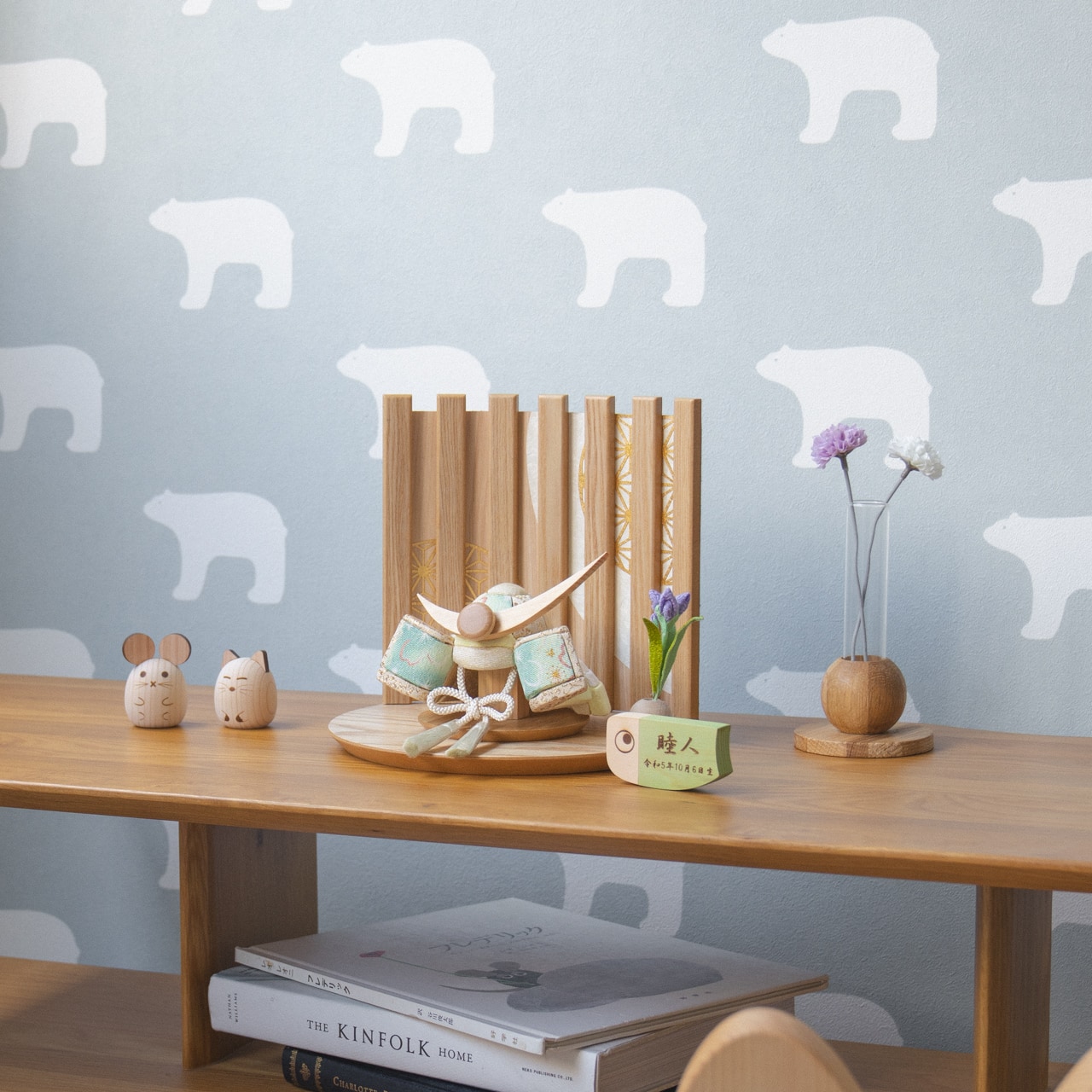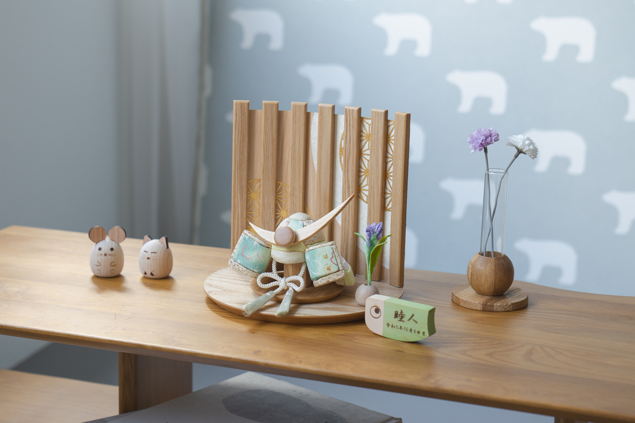 鍬形や衝立の素材には、富士山麓の無垢のヒノキを使用しています。