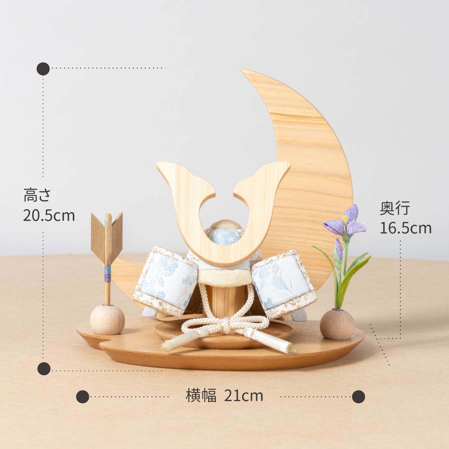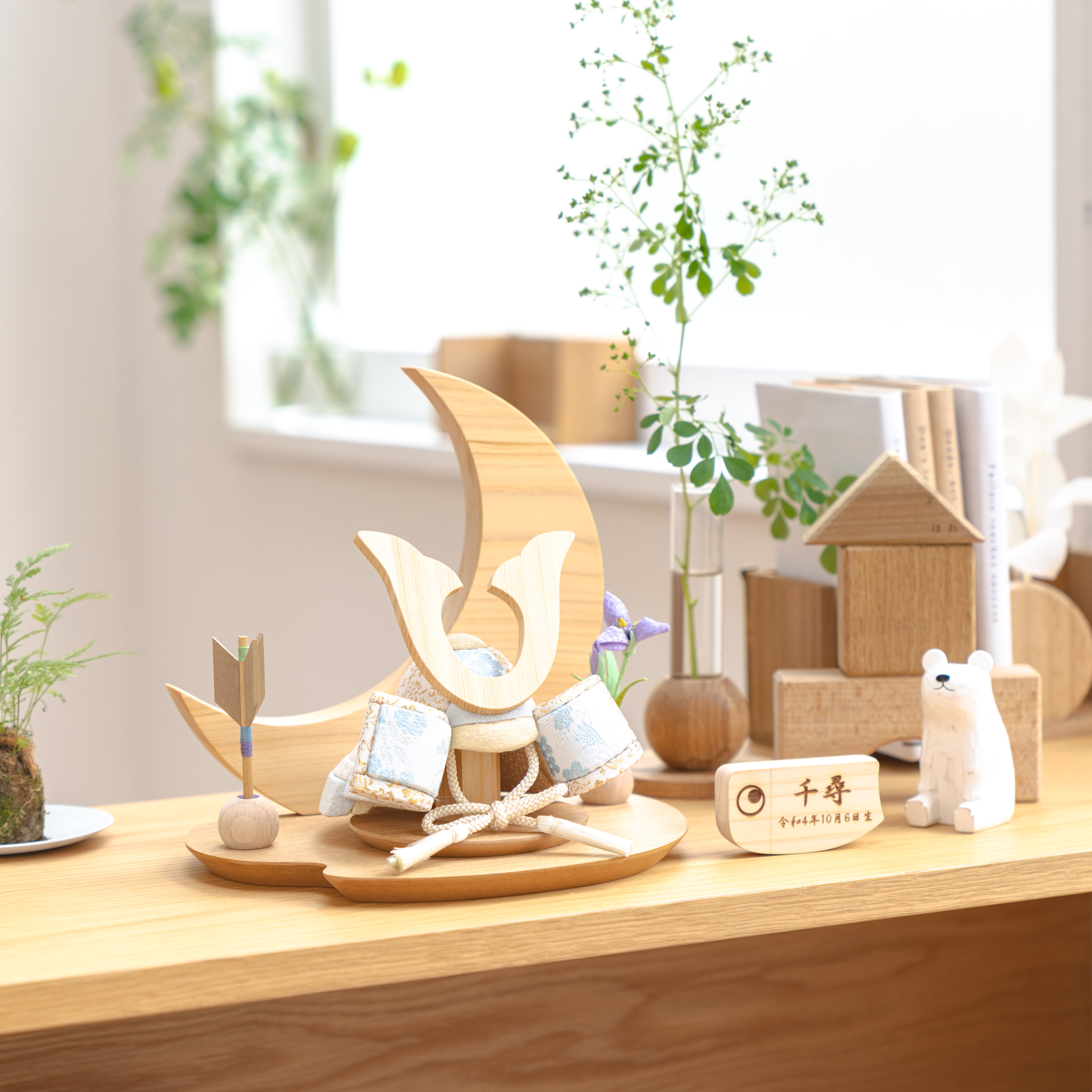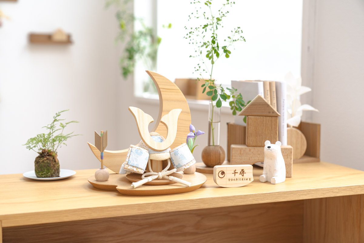 天然木の風合いを生かした木都の破魔弓は五月人形と一緒に飾るのにぴったり。