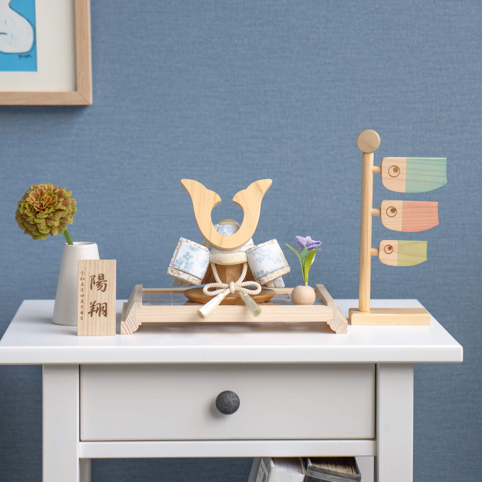 てづくり工房「木都」の職人が、伝統工芸の技術と天然木の素材を活かし、真心込めて1つ1つ丁寧につくりました。親しみやすく、お子様と 手に取って一緒に飾れる「ことの木目込かぶと」です。