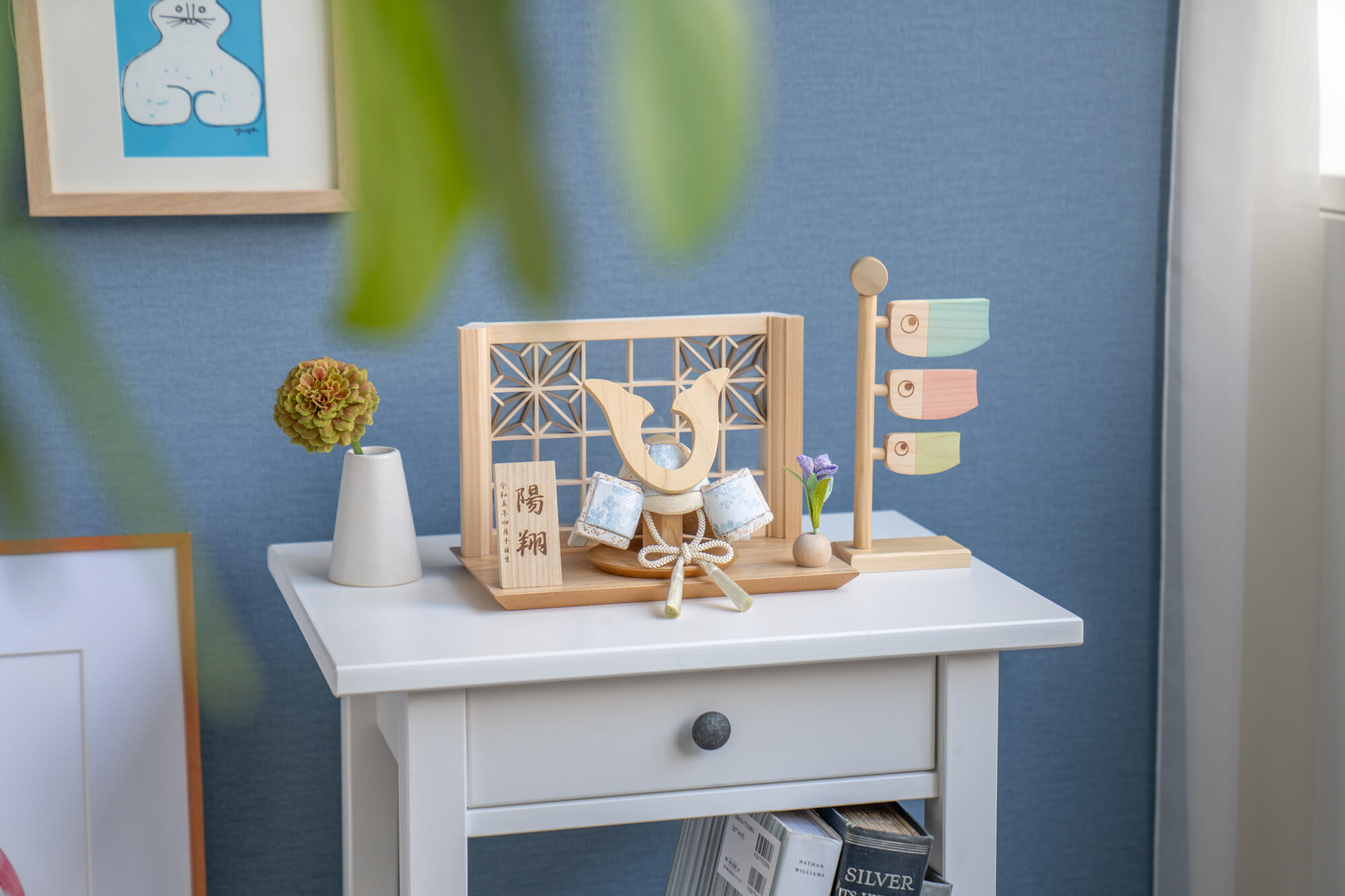 屏風として飾れば組子細工の美しさが、下台として飾れば木目込兜の愛らしさが引き立ちます。