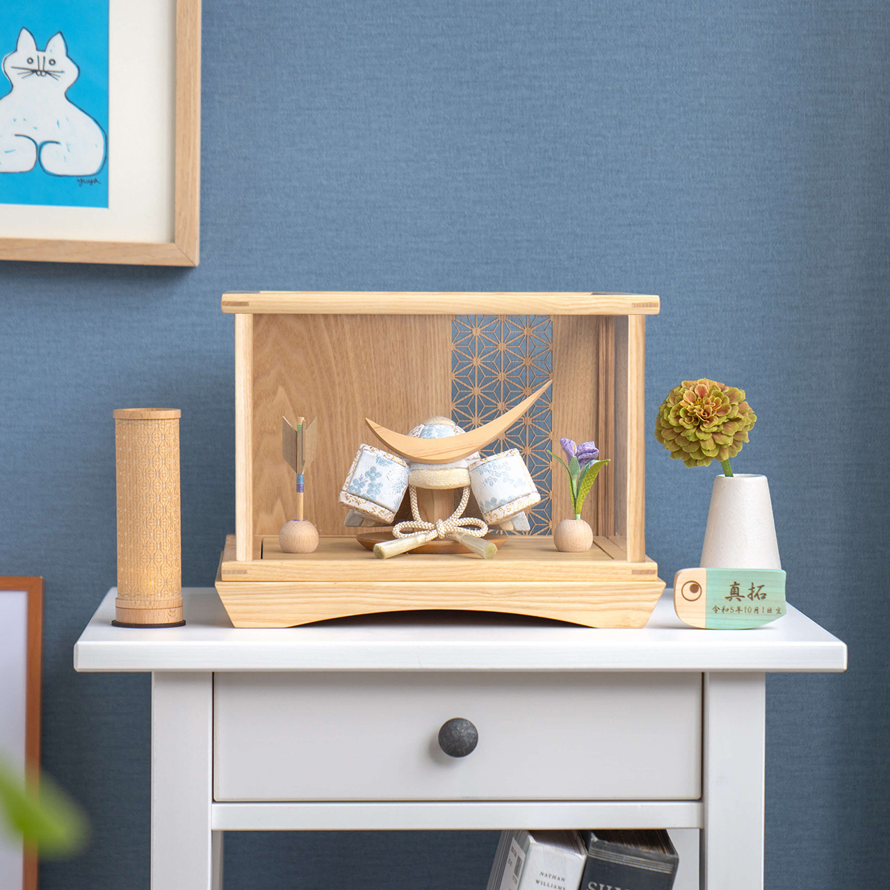 コンパクトサイズのお人形・お飾りと一緒に飾るのにぴったりな名前旗です。