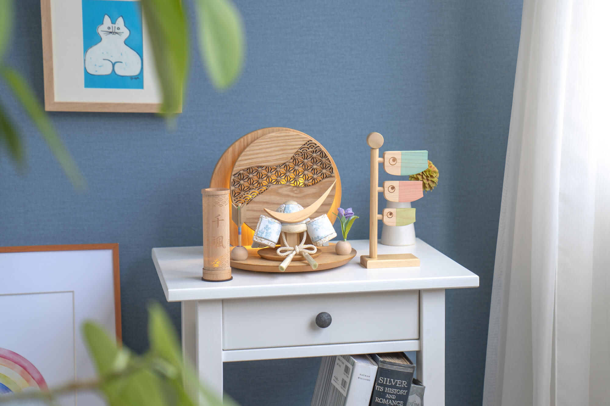 てづくり工房「木都」の職人が、伝統工芸の技術と天然木の素材を活かし、真心込めて1つ1つ丁寧につくりました。親しみやすく、お子様と 手に取って一緒に飾れる「ことの木目込かぶと」です。