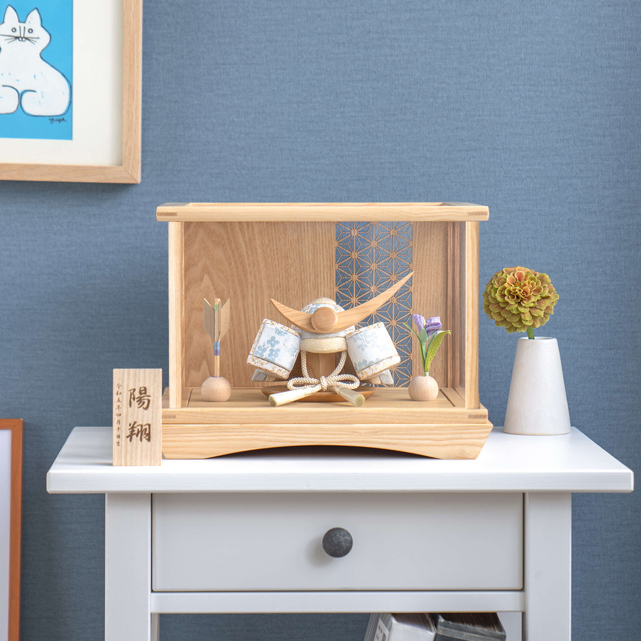 てづくり工房「木都」の職人が、伝統工芸の技術と天然木の素材を活かし、真心込めて1つ1つ丁寧につくりました。親しみやすく、お子様と 手に取って一緒に飾れる「ことの木目込かぶと」です。