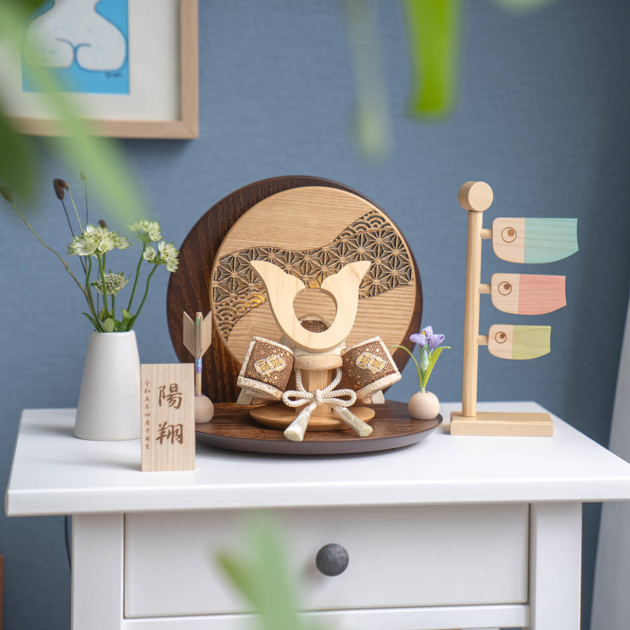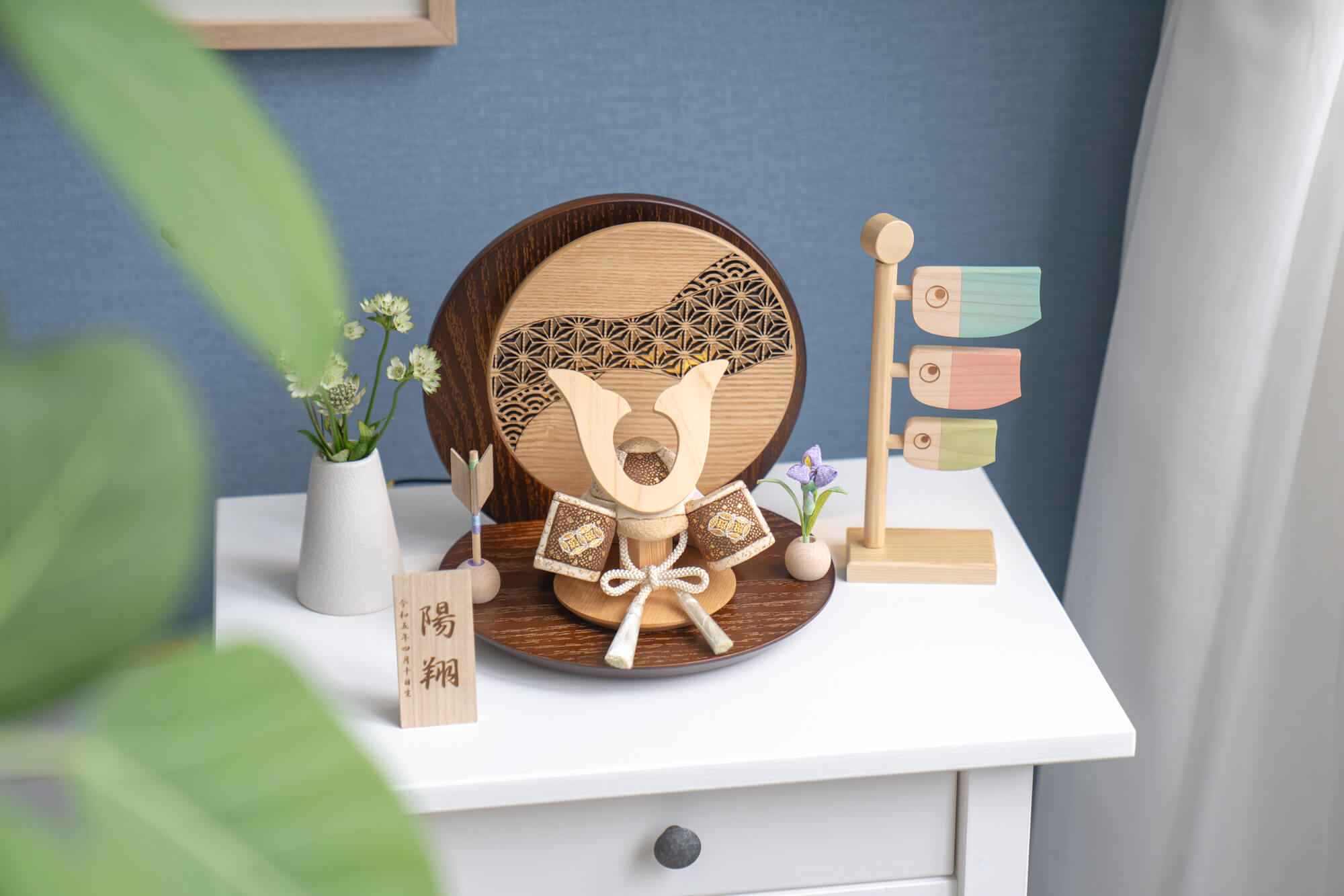 日本の天然木でつくった節句人形 ことの木目込かぶと