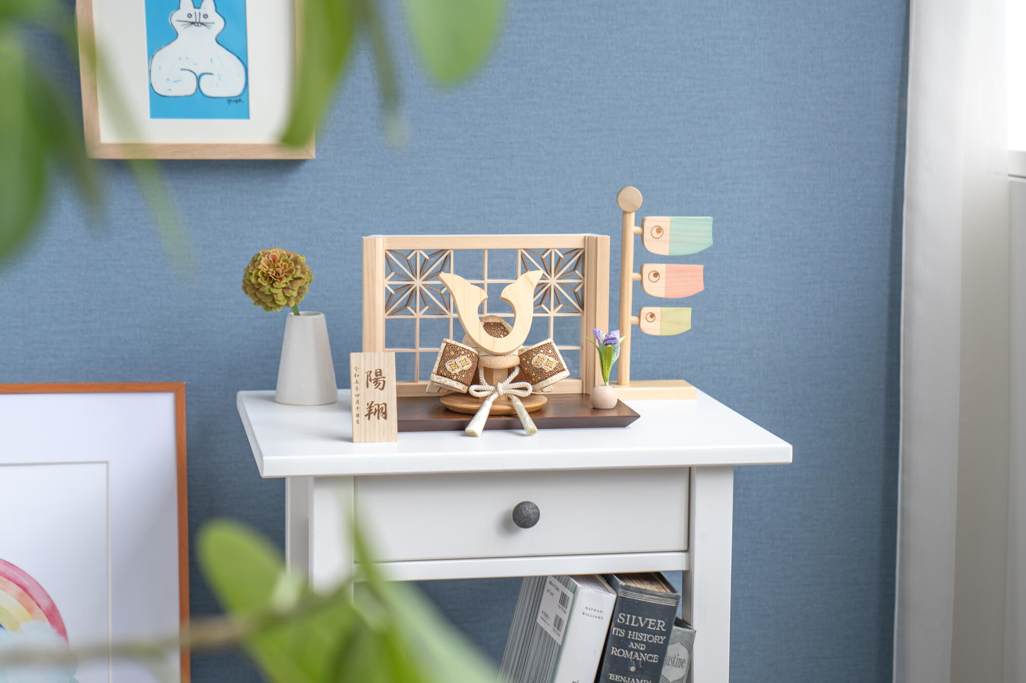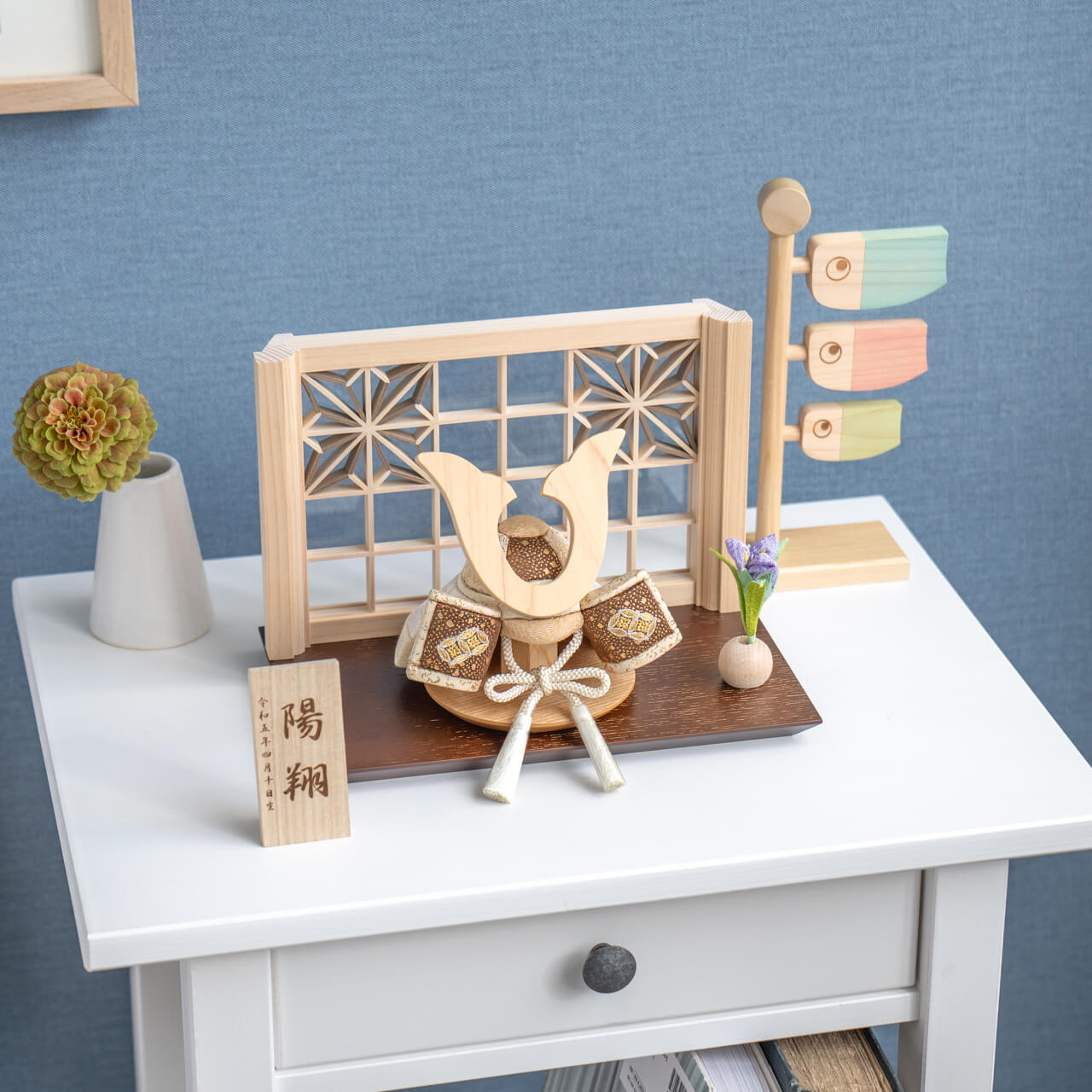 屏風として飾れば組子細工の美しさが、下台として飾れば木目込兜の愛らしさが引き立ちます。