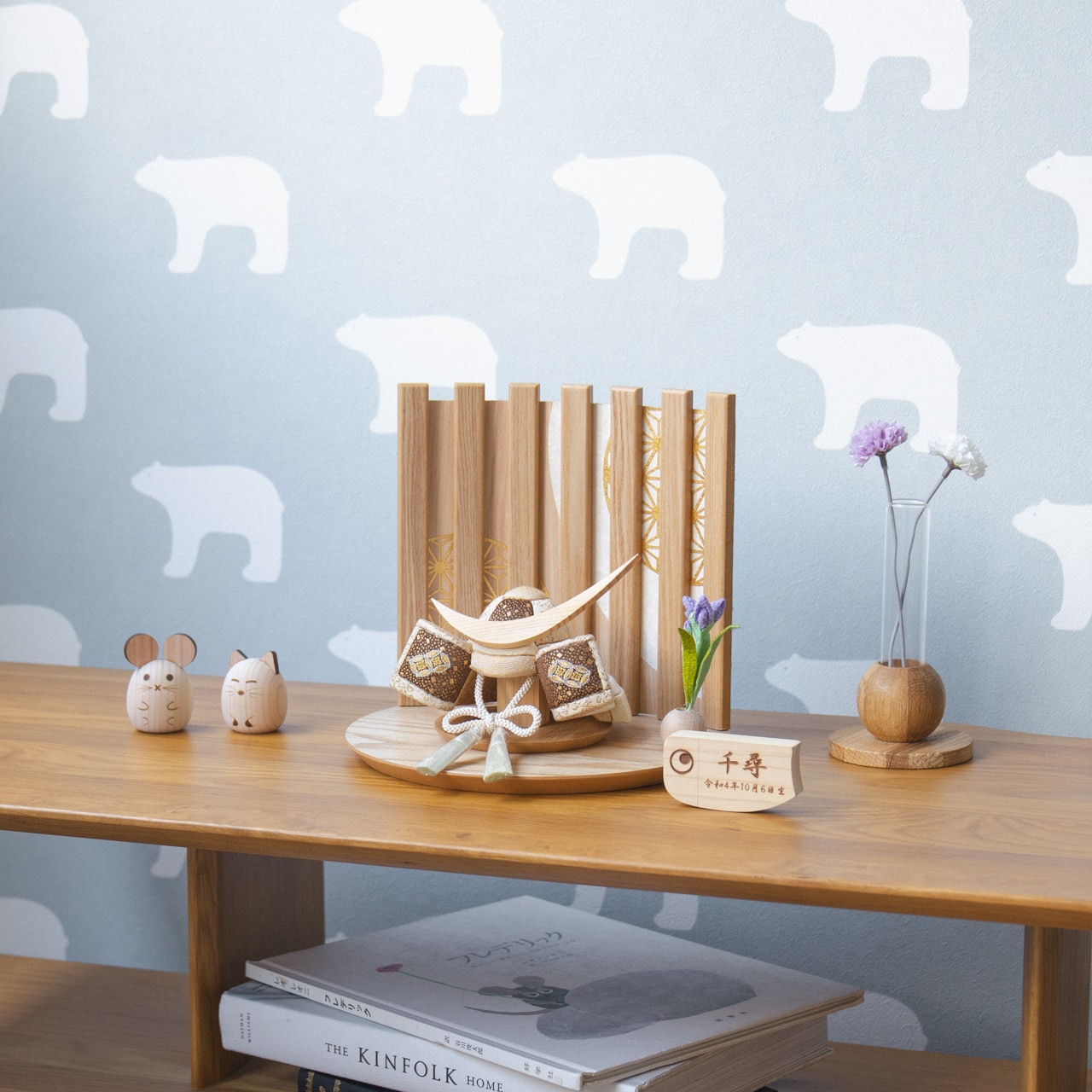 日本の天然木でつくった節句人形 ことの木目込かぶと