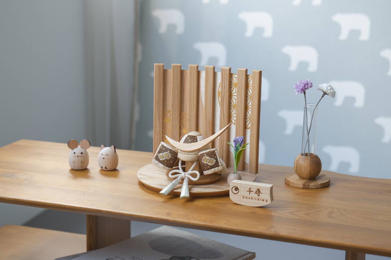 鍬形や衝立の素材には、富士山麓の無垢のヒノキを使用しています。