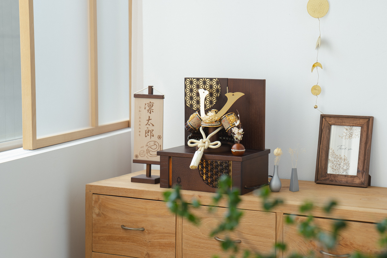 伝統的な兜をモダンに仕上げ茶で統一されたシンプルなデザイン