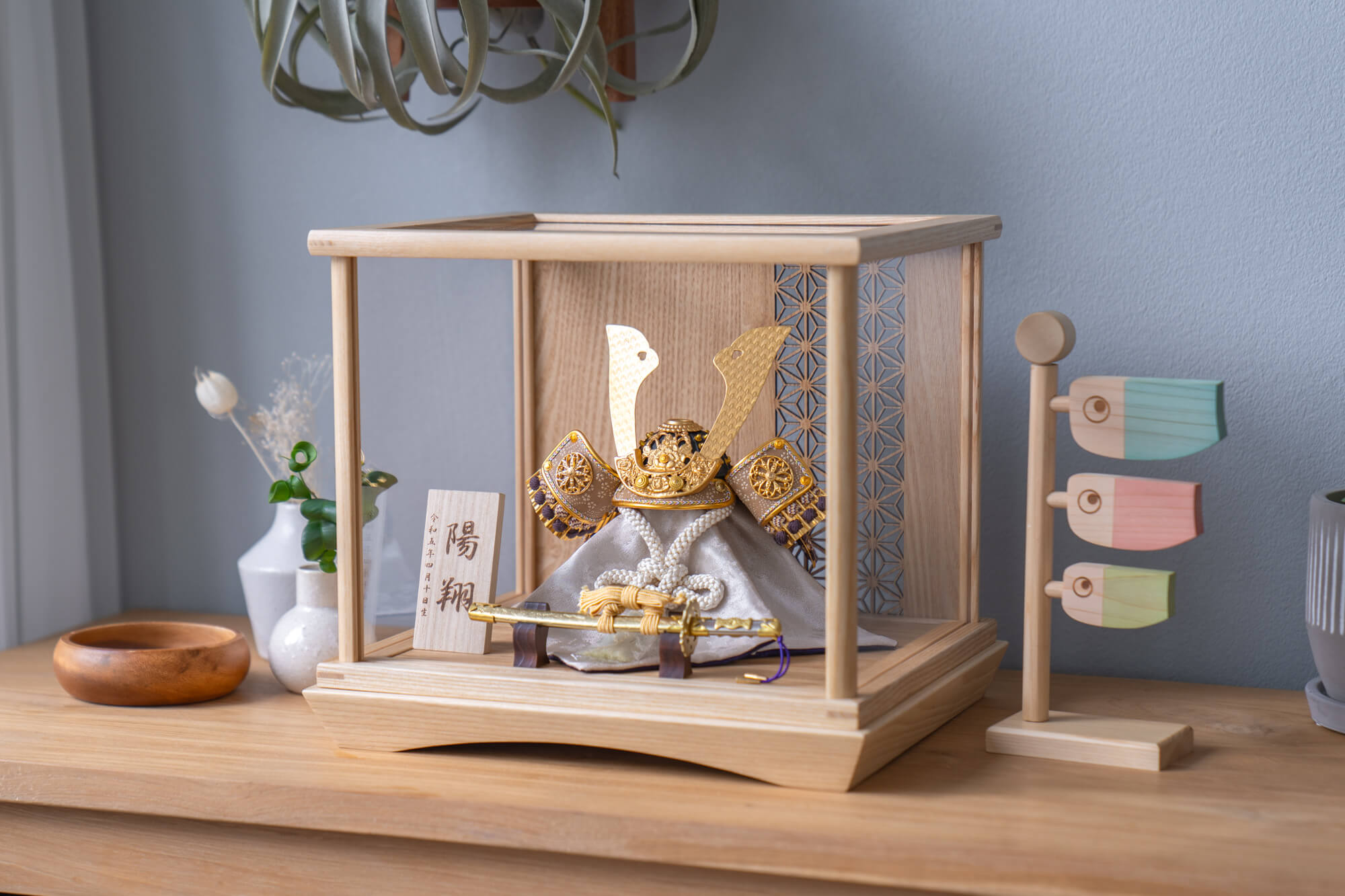 天然木の風合いを生かした木都の破魔弓は五月人形と一緒に飾るのにぴったり。