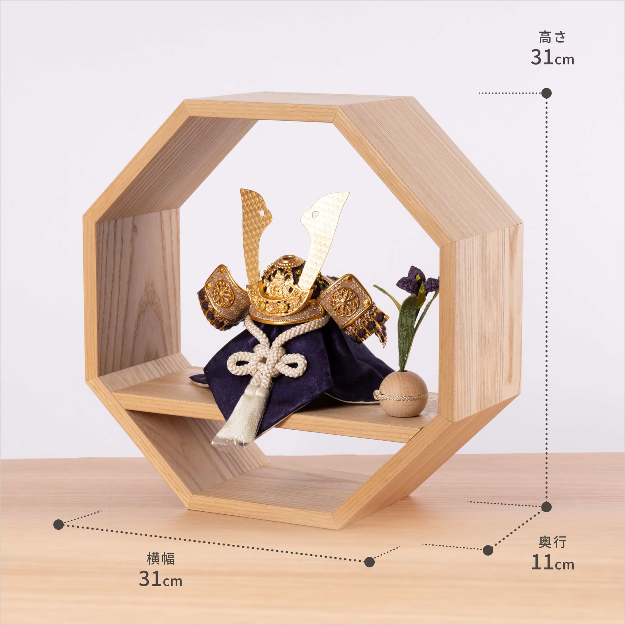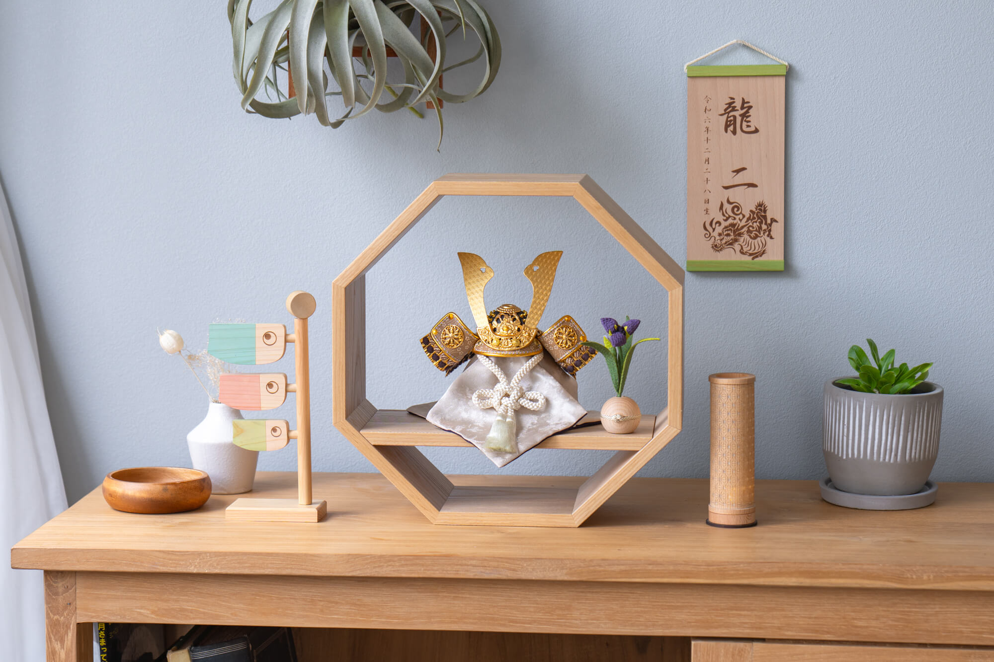 天然木の風合いを生かした木都の破魔弓は五月人形と一緒に飾るのにぴったり。