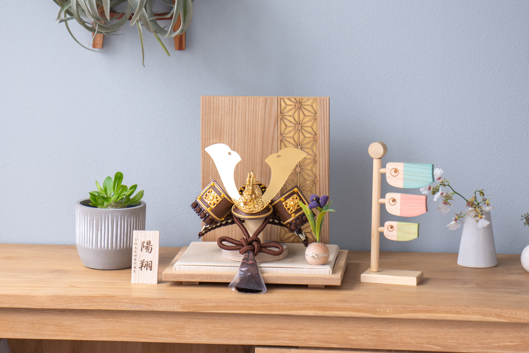 天然木の風合いを生かした木都の破魔弓は五月人形と一緒に飾るのにぴったり。