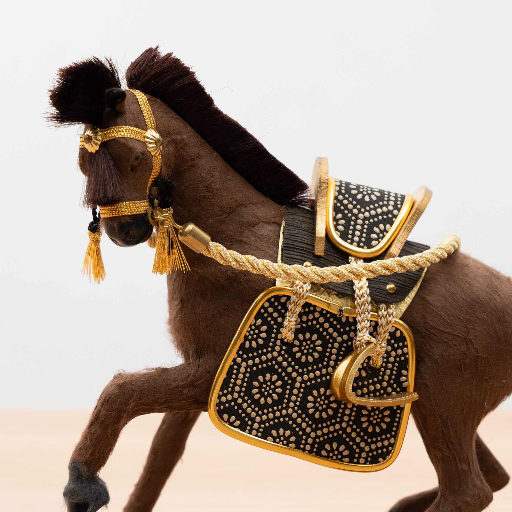 鞍や手綱やくつわ、あぶみなどの細部までこだわった、躍動感溢れる飾り馬です。