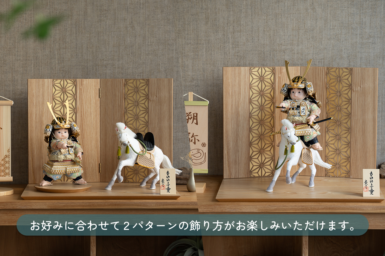 子供大将は馬飾りに乗せても、そのまま立たせてもお飾りいただけます。