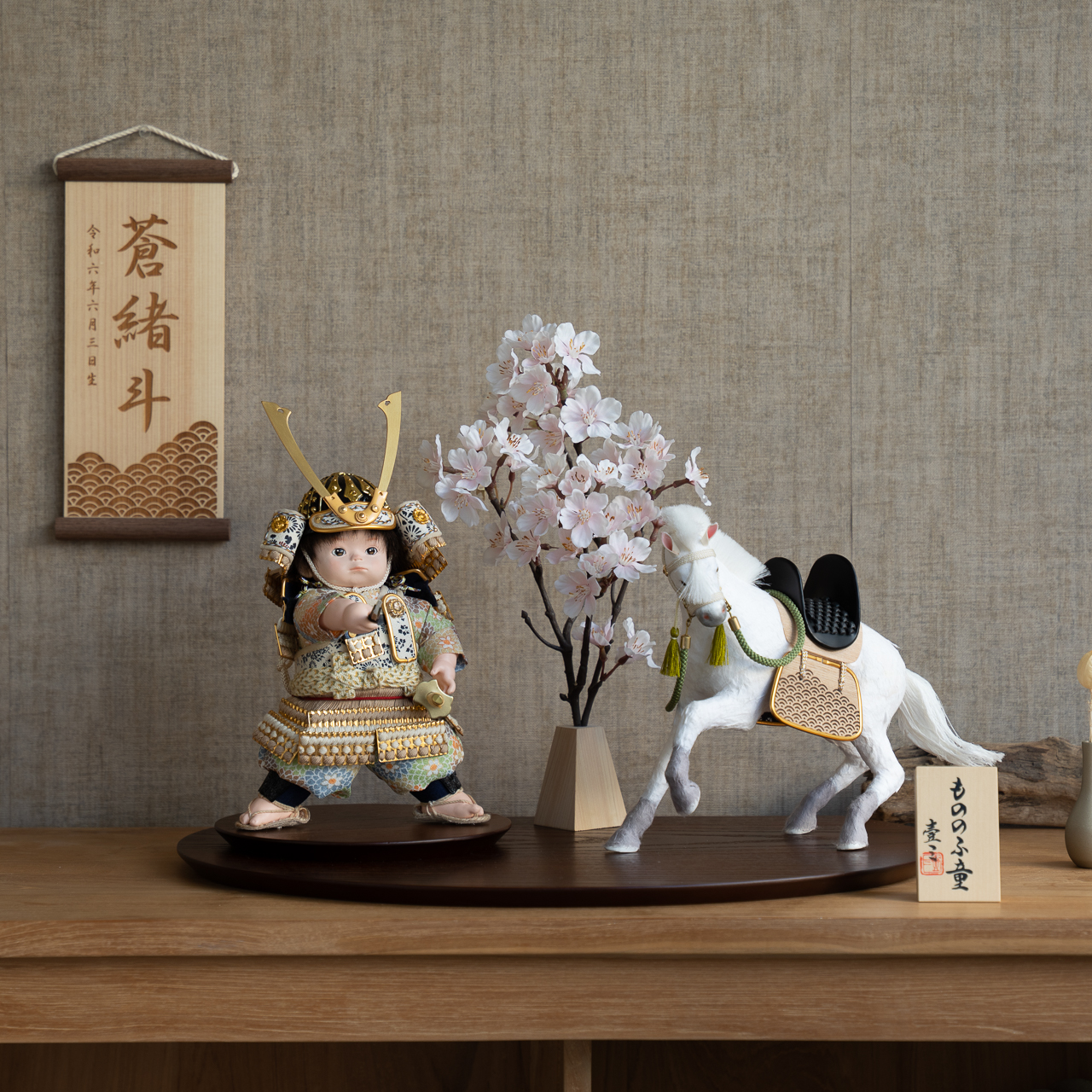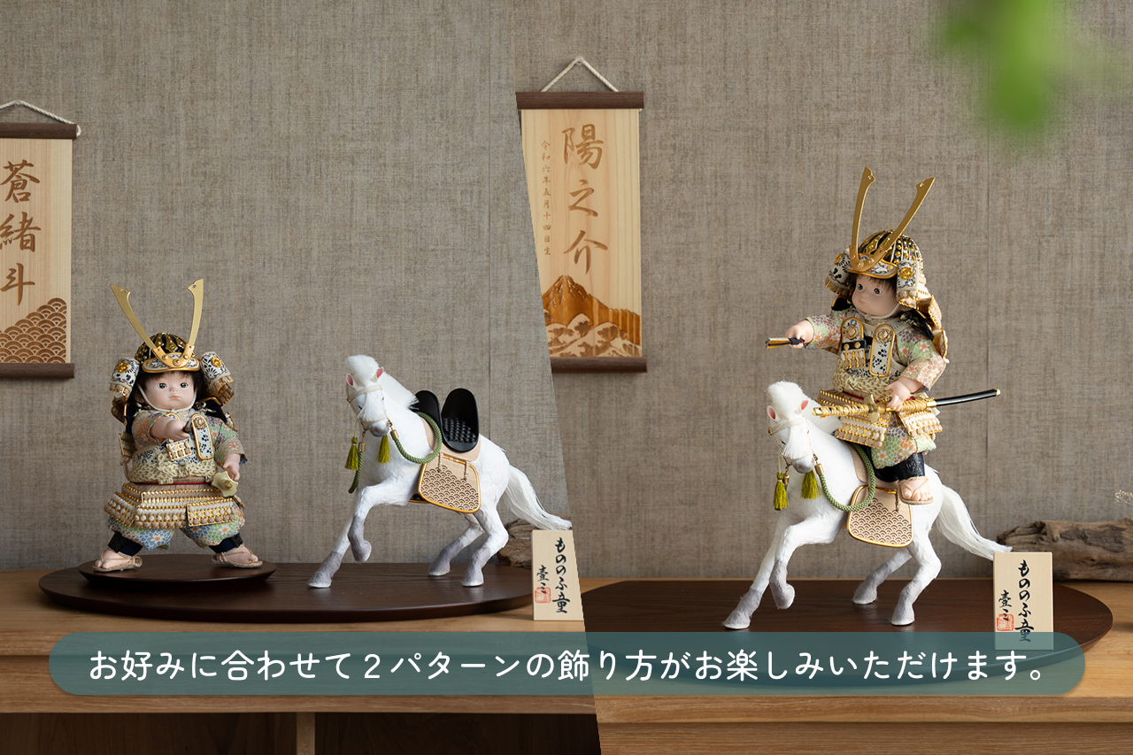 子供大将は馬飾りに乗せても、そのまま立たせてもお飾りいただけます。
