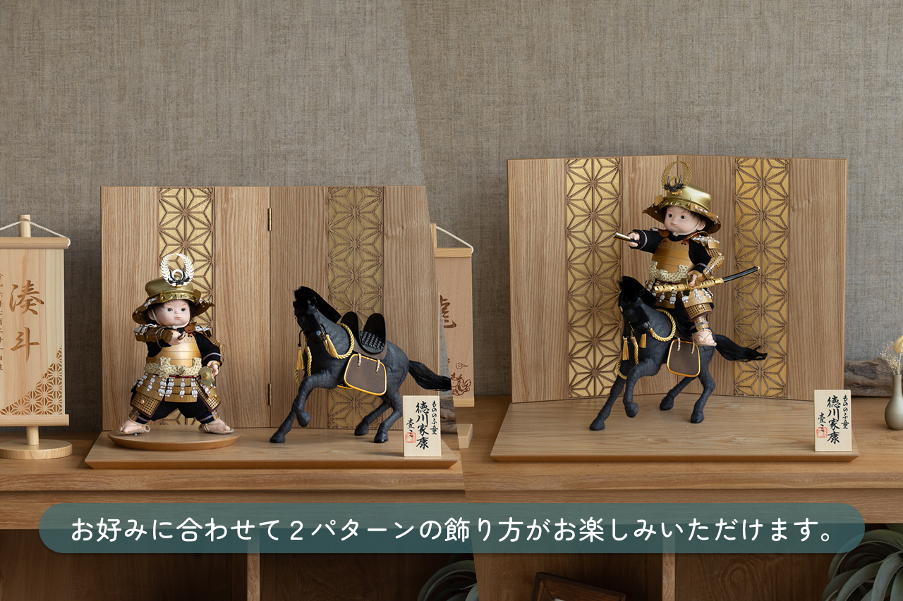 子供大将は馬飾りに乗せても、そのまま立たせてもお飾りいただけます。