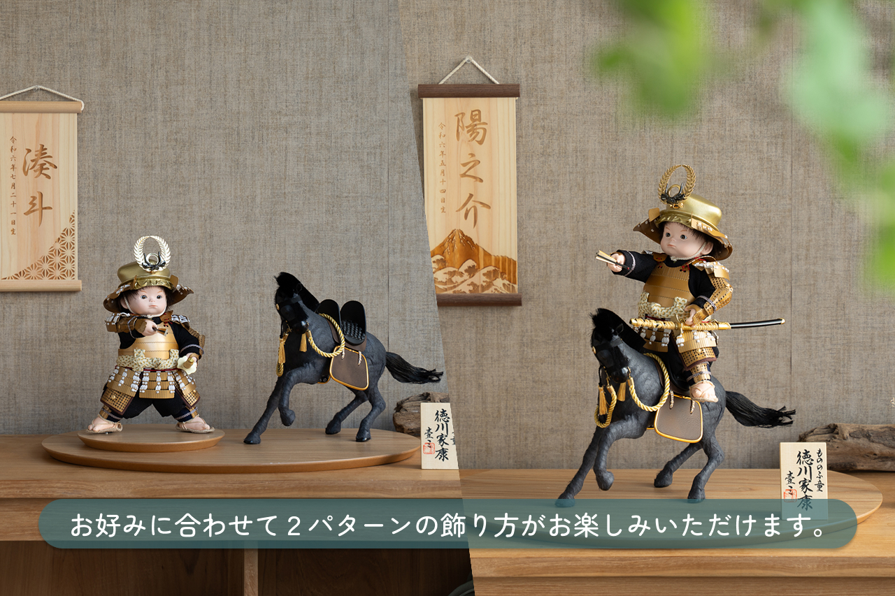子供大将は馬飾りに乗せても、そのまま立たせてもお飾りいただけます。