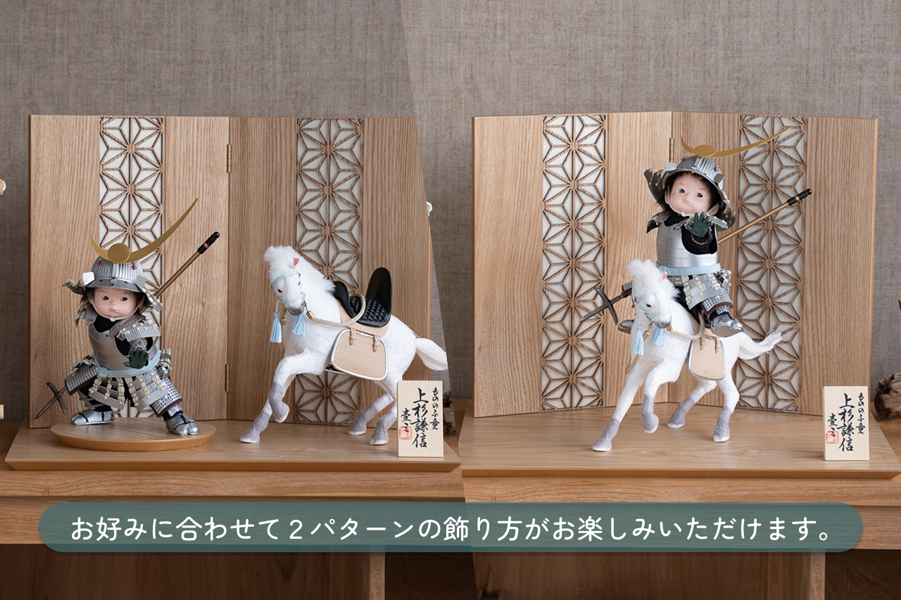 子供大将は馬飾りに乗せても、そのまま立たせてもお飾りいただけます。