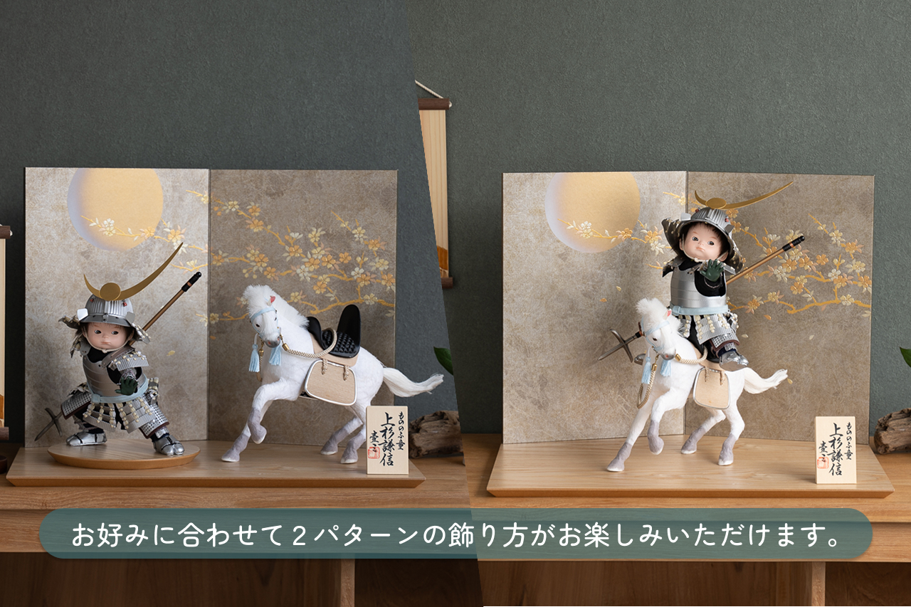 子供大将は馬飾りに乗せても、そのまま立たせてもお飾りいただけます。