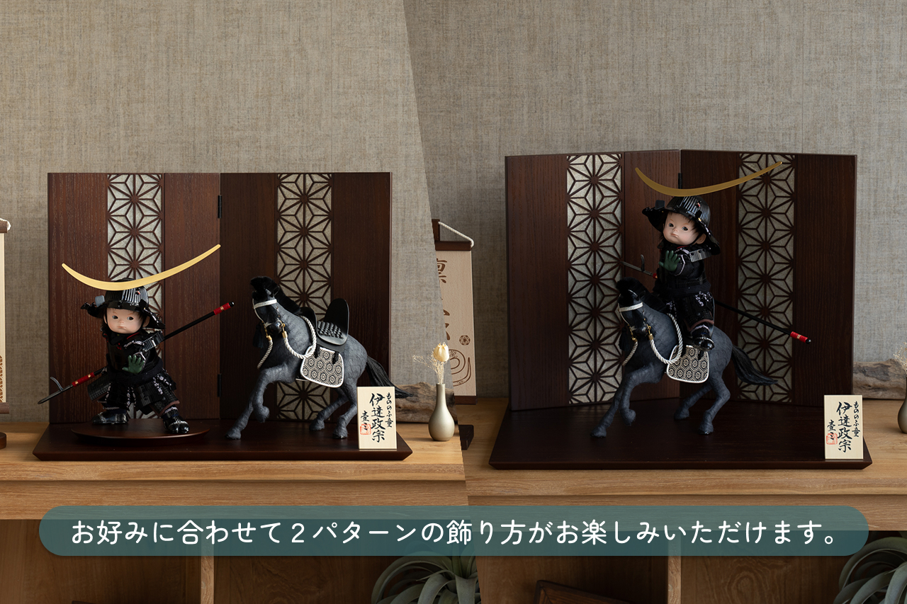 子供大将は馬飾りに乗せても、そのまま立たせてもお飾りいただけます。