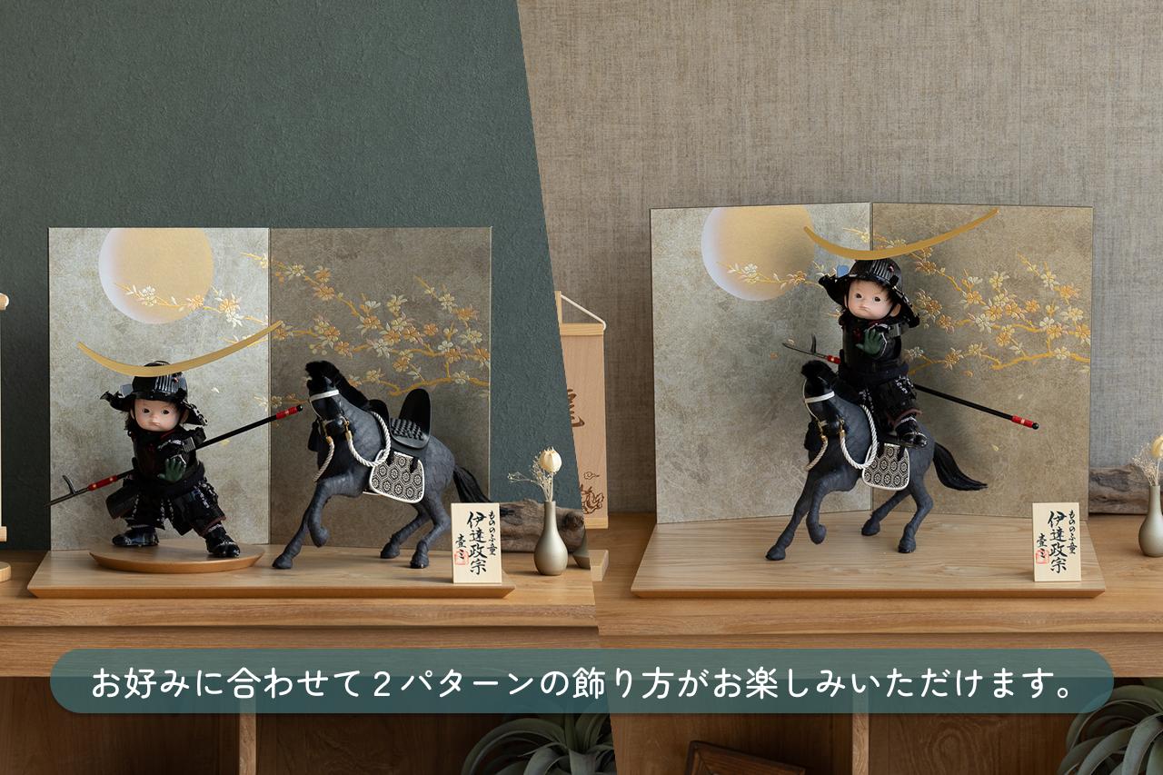 子供大将は馬飾りに乗せても、そのまま立たせてもお飾りいただけます。