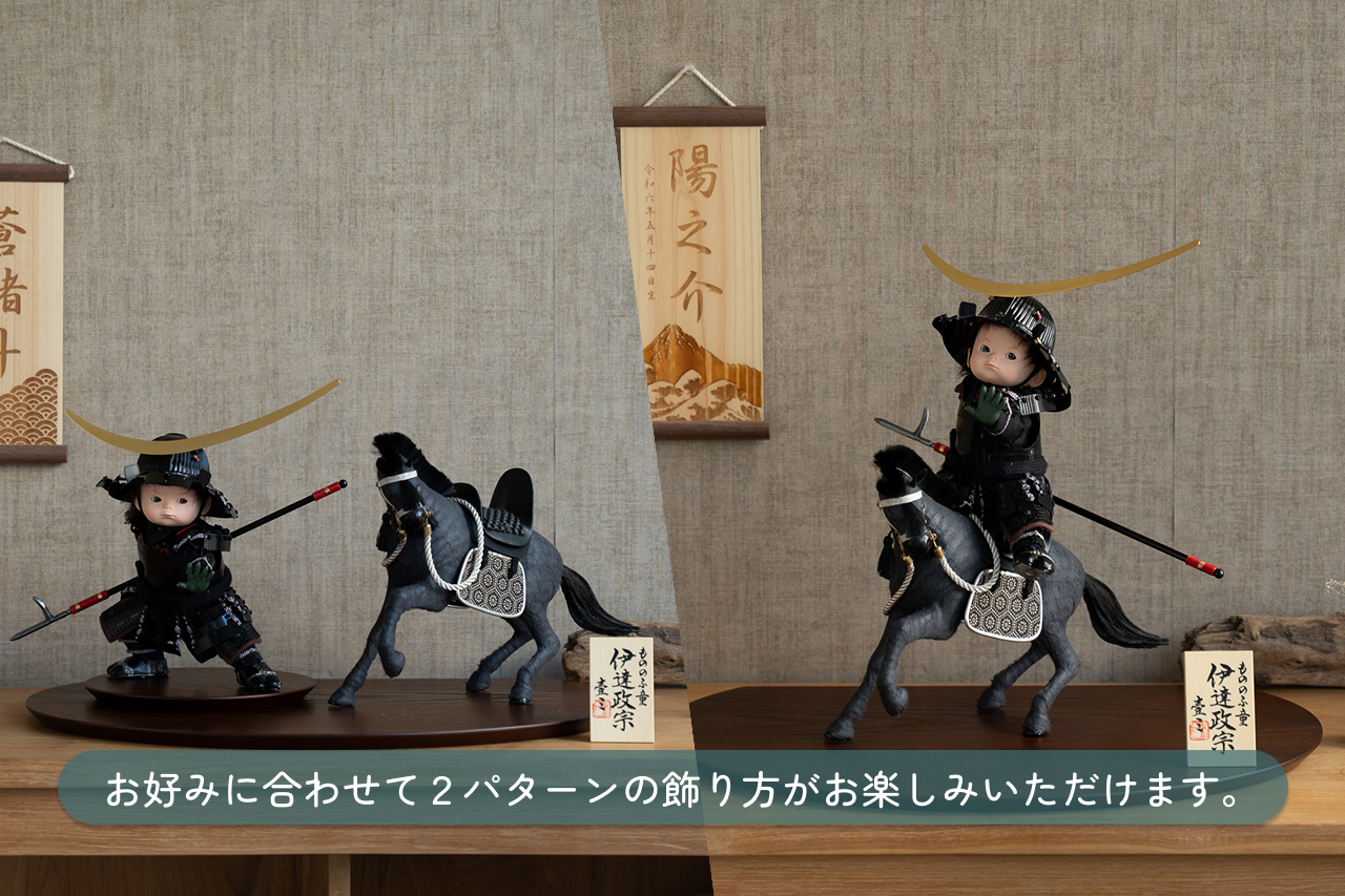 子供大将は馬飾りに乗せても、そのまま立たせてもお飾りいただけます。